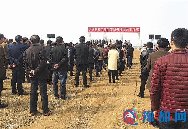 2016年泌阳县第一批亿元以上重点项目集中开工仪式设在由河南恒都夏南牛开发有限公司投资兴建的牛血生物制剂项目工地,该项目占地104亩,计划总投资5.6亿元,分三期建设牛血生物制剂工厂、原料处理厂、检疫检验控制中心、实验站等,主要开发生产牛血浆蛋白粉、牛免疫蛋白粉、牛血球蛋白粉等几十种生物制剂。同时,开工建设的还有3个项目,分别是投资3亿元、年产1.6亿个彩印包装箱(盒)的泌阳彩盛印刷包装项目,投资3.3亿元、年产290万件羊绒衫的河南神艺服饰加工项目,投资13.5亿元的铜山湖科技生态园旅游基础设施建设项目。记者 侯伟峰 摄