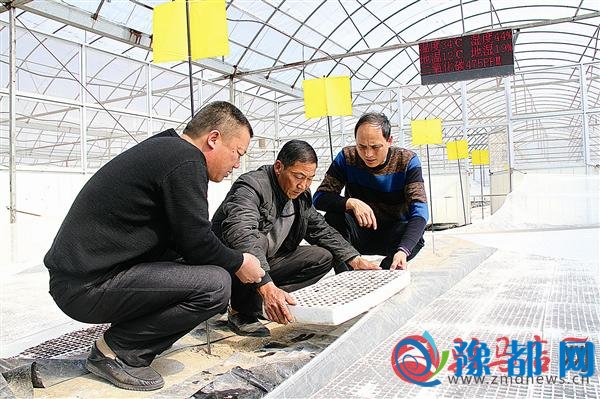 在泌阳县铜山基地烟叶育苗工厂内,烟叶技术人员正在查看烟苗出土情况。