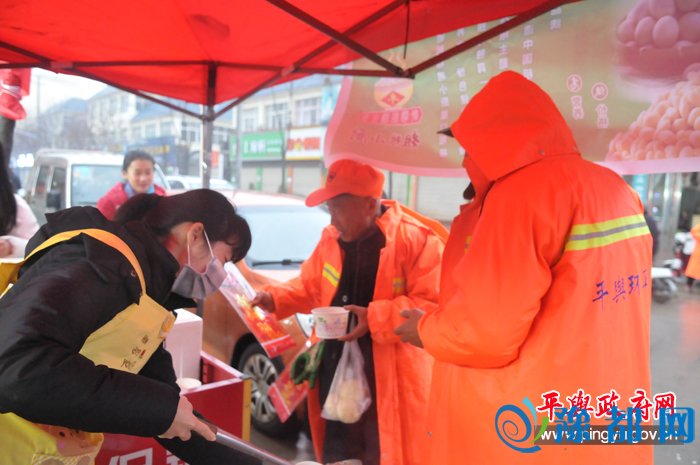 1月5日是传统的农历腊八节,上午,平舆县志愿者联合会、平舆县星火志愿团联系部分爱心商家开展的“爱心送粥 青暖中原”活动在县城温暖举行。当天,30位志愿者在全县3个地点发放腊八粥近千份,包子三百多个,手套七百双,春联300套,为环卫工人、出租车司机和普通市民送上爱心和腊八节的祝福。他们的热情、热心服务,把温暖传遍全平舆。