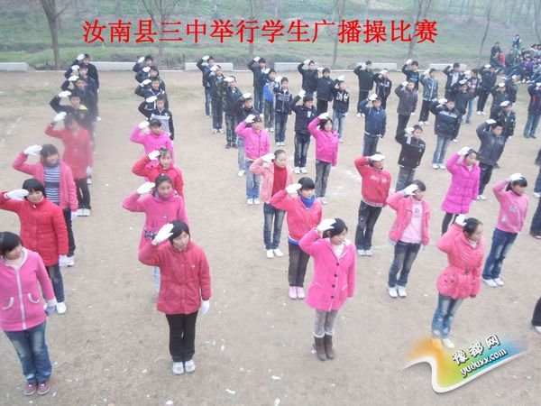 下午,汝南县三中在学校河滨体育场举行了学生《舞动青春》广播体操比赛。这次活动是我校主动落实推行“阳光体育运动”的一次大检阅,是对体育教学工作的一次大检阅,也是校风、班风的一次大检阅。