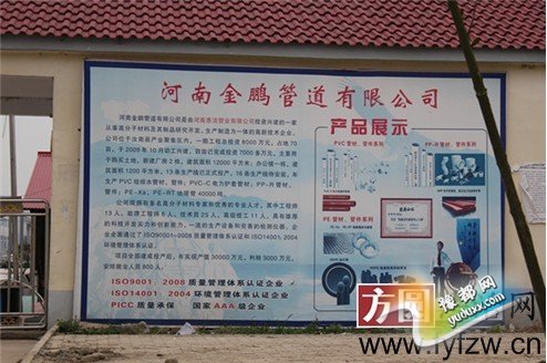 在汝南县产业聚集区河南金鹏管道有限公司大门口,张贴一块明显发旧的公司简介中清晰的写着,河南金鹏管道有限公司是由河南惠洁管业有限公司投资兴建的一家从事高分子材料及其制品研究开发、生产制造为一体的高新技术企业。公司位于汝南县产业聚集区内,年生产PVC给排水管材、管件;PVC-C电力护套管12000吨。