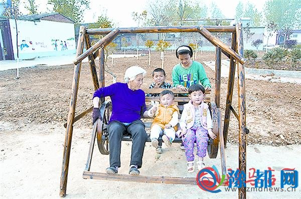 昨日,韩寨乡耿陈村的一位老人与孩子们一起荡秋千。韩寨乡耿陈村加大改善农村人居环境力度,建设了游园等,方便村民休闲。