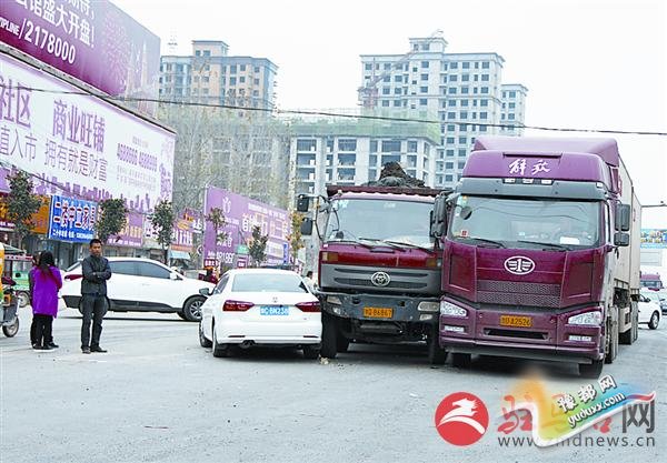 当日下午3时许,记者在现场看到,在西关大道红绿灯下有3辆机动车挤在一起,一辆大型货车和一辆后八轮拉土车并头朝北,一辆白色轿车头朝南。据轿车司机说,他的车和大型货车都是正常行驶,是拉土车急驶而来酿成事故。
