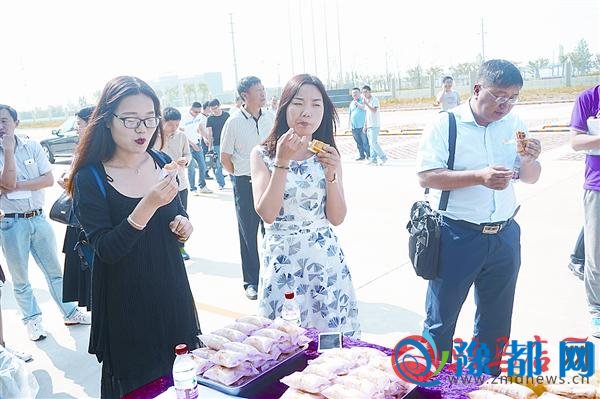 在河南徐福记食品有限公司,记者们在品尝糕点。