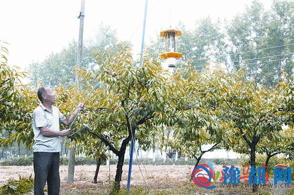 “原来,从桃树开花到成熟,要喷洒六七遍农药,每次需要500多元钱,自从买了杀虫灯,我每年5月初将灯往上一挂,就不用担心桃子生病虫害了。因为不用打药,桃子吃起来更健康。”