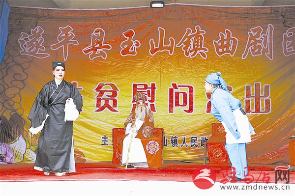 昨日,在遂平县玉山镇吴寨村村委大院里,玉山镇曲剧团扶贫慰问演出正在进行。