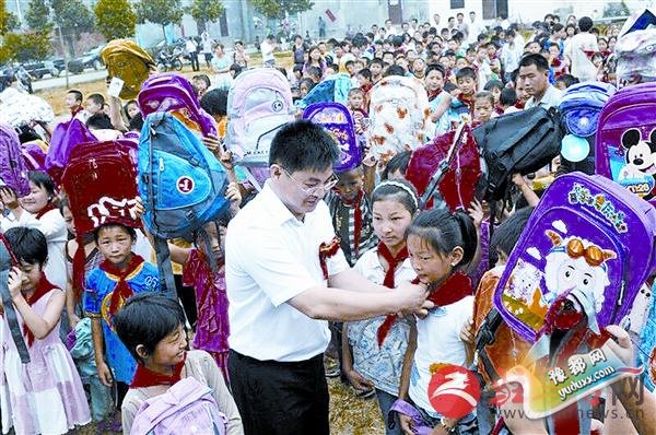 刘振江在汝南县一所小学为学生赠送学习用品。