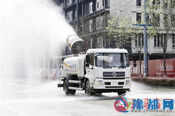 近期,洒水车从早晨一直忙到深夜,对我市的道路进行洒水降尘,保持道路干净。 记者 张 朝 摄