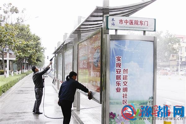 近日,市公交公司的工作人员对市区公交站台进行保洁。 记者 张 朝 摄