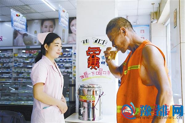 药房工作人员为环卫工人递上凉茶。