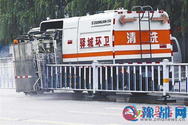 8月24日,市区中华大道上多功能清洁车在清洗街头栏杆。 记者 张 朝 摄
