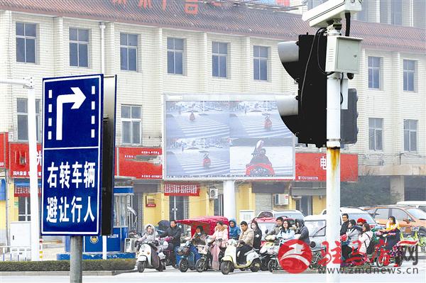 1月11日,在市区解放大道、文明大道交叉口,一名闯红灯的骑车人被曝光在路边的大屏幕上。完备的监控系统、提示系统保障道路交通安全。 记者 张 朝 摄