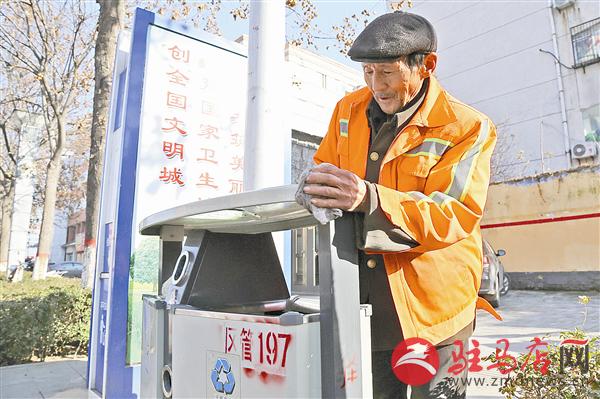 近日,在市区文明大道,环卫保洁人员在擦拭街头垃圾箱,把卫生清理做到细微处。记者 张 朝 摄