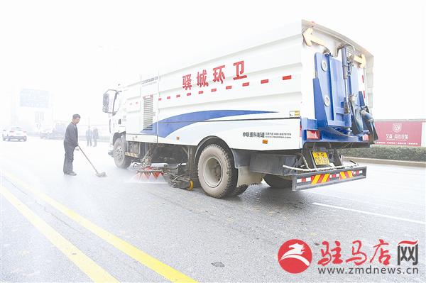 近日,在市区淮河大道西段,环卫工人加大建筑工地周边道路洒水、清扫力度,保障街道卫生整洁。记者 张 朝 摄