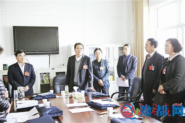 驿城区委书记贾迎战(左二),驿城区委副书记、区长毕启民(左一)在区“两会”期间,参加蚁蜂镇代表团讨论发展规划。